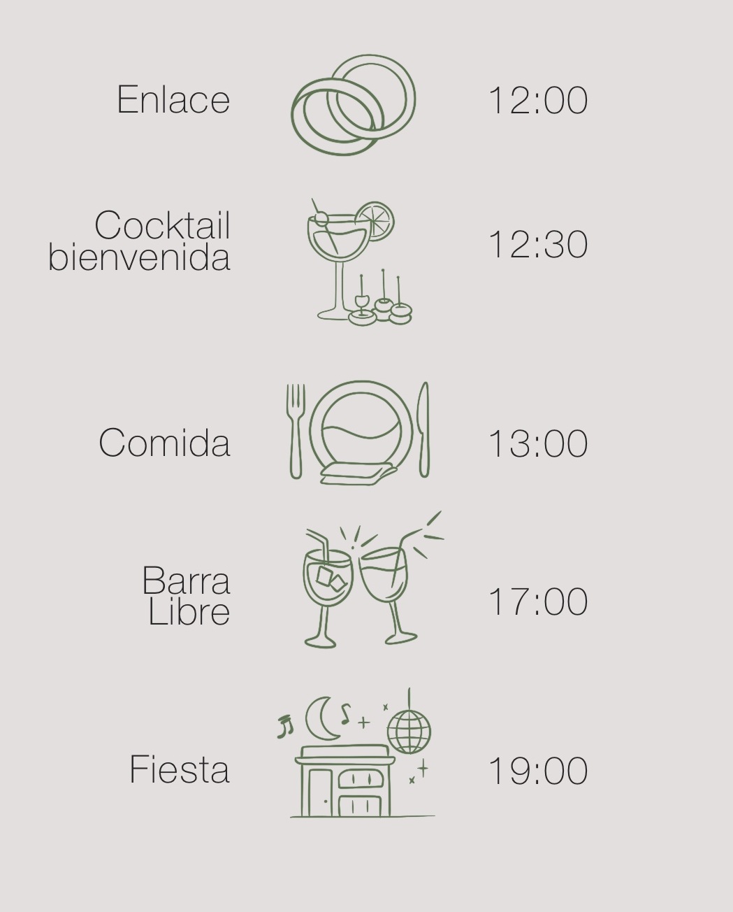 Enlace — 12:00 · Cocktail bienvenida — 12:30 · Comida — 13:00 · Barra libre — 17:00 · Fiesta — 19:00